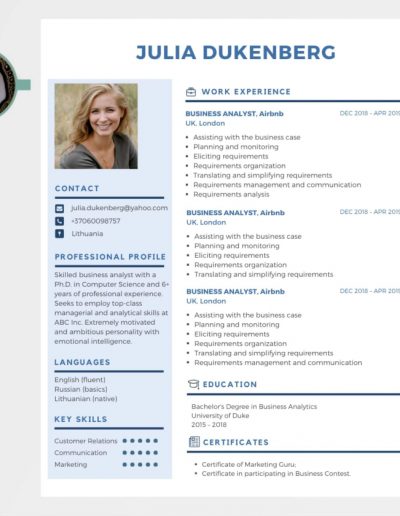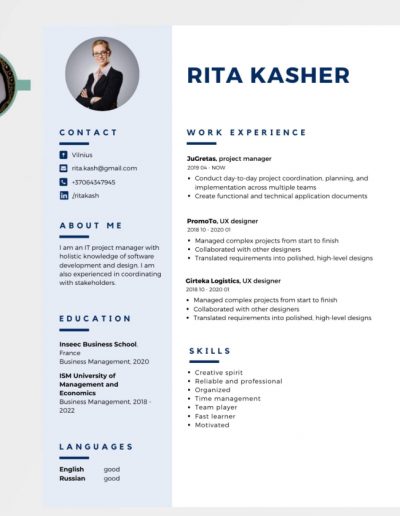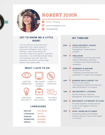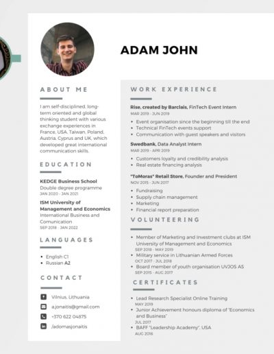 “Wow, a very neat and nice looking CV came out! Before ordering, I really doubted whether I would be able to get a CV that would suit a new student entering the job market. But all my experiences, volunteering and various activities have been so beautifully described. I am really happy with the result and I boldly send my CV to all companies. The communication with the CV writer myself was very smooth and clear, I always received a quick response and corrections. I would definitely advise those who are still studying or have recently graduated from university and do not yet know what you can write on your CV! ”